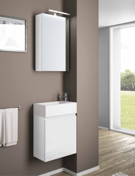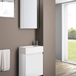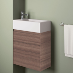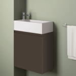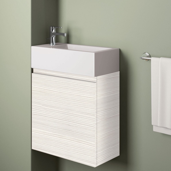 Der Waschtisch aus Keramik inklusive grifflosem Unterschrank passt mit seiner Breite von 45 cm und Tiefe von 25 cm perfekt in kleineste Badezimmer und Gästebäder. Eine