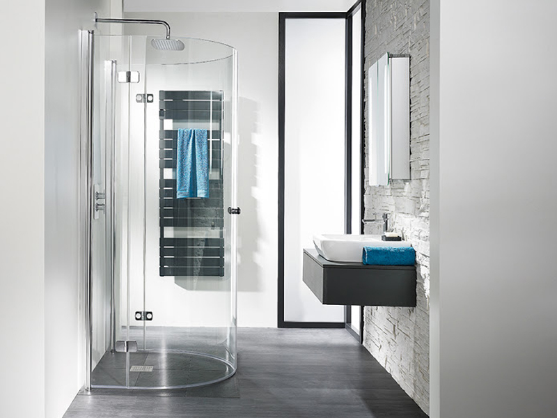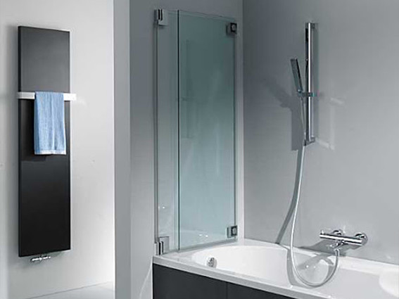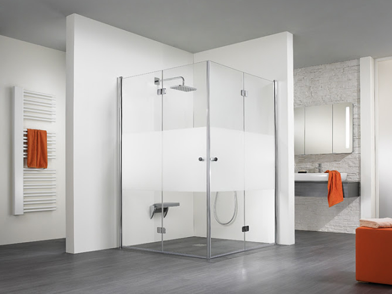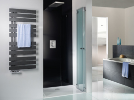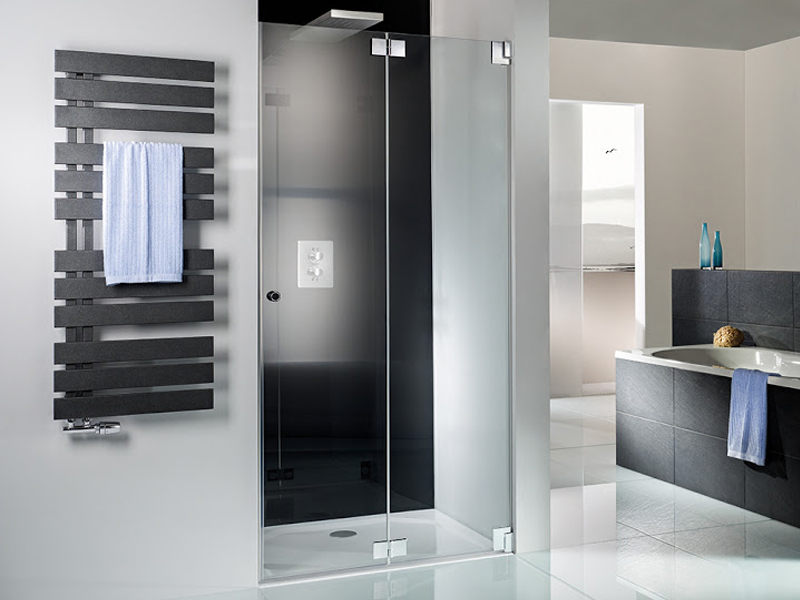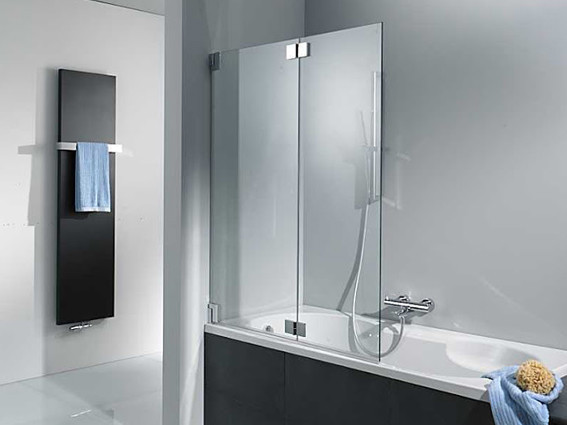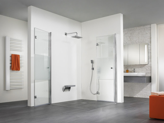 Wer gerade nicht duscht, braucht auch keinen Spritzschutz! Diese Duschtüren aus Echtglas können an die Wand geklappt werden ...